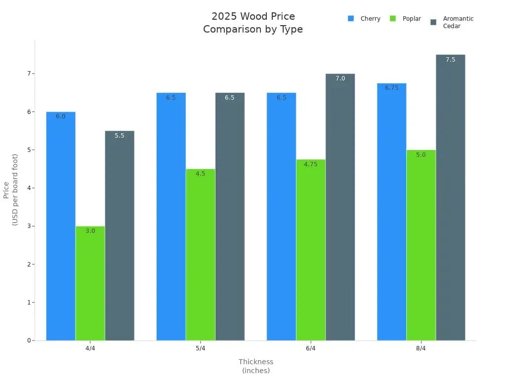 Cherry and premium cedar usually cost more in 2025. Cedar prices jumped because of new duties. If you want a budget option, poplar and pine are cheaper.