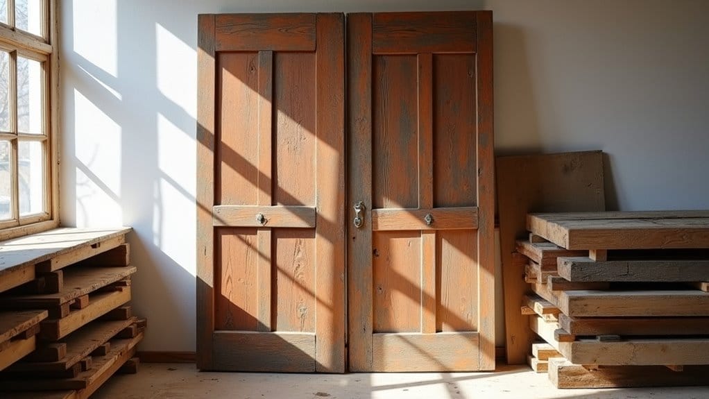 You’ll find reclaimed lumber in old barns, featuring weathered oak and pine that’s developed rich patinas over decades of use.